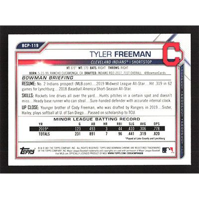 This is a 2021 Bowman Chrome Sapphire Prospects Tyler Freeman baseball card. The card is #BCP-119 and pictures show condition. Team(s): Cleveland Indians