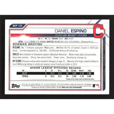 This is a 2021 Bowman Chrome Sapphire Prospects Daniel Espino baseball card. The card is #BCP-123 and pictures show condition. Team(s): Cleveland Indians