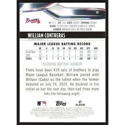 This is a 2021 Bowman Platinum William Contreras baseball card. The card is #36 and pictures show condition.