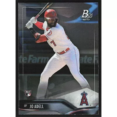 This is a 2021 Bowman Platinum Jo Adell baseball card. The card is #5 and pictures show condition.