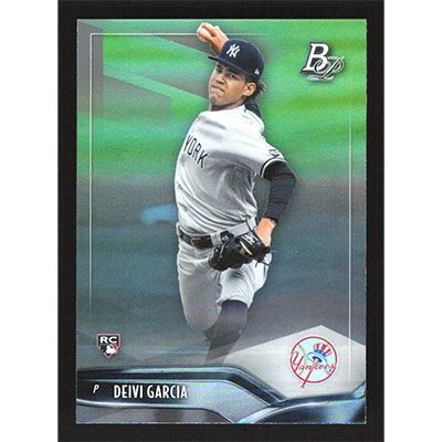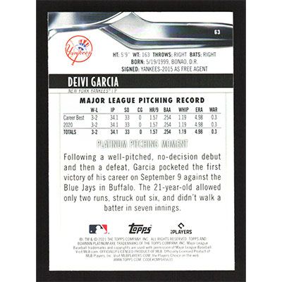 This is a 2021 Bowman Platinum Deivi Garcia baseball card. The card is #63 and pictures show condition.
