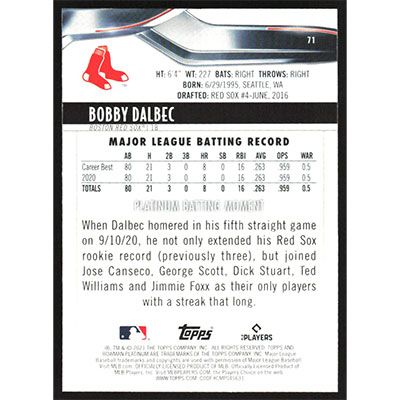 This is a 2021 Bowman Platinum Bobby Dalbec baseball card. The card is #71 and pictures show condition.