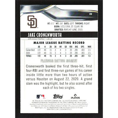 This is a 2021 Bowman Platinum Jake Cronenworth baseball card. The card is #89 and pictures show condition. Team(s): San Diego Padres Rookie Card (RC)