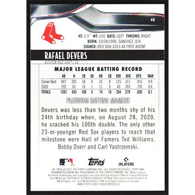 This is a 2021 Bowman Platinum Ice Foil Rafael Devers baseball card. The card is #46 and pictures show condition.
