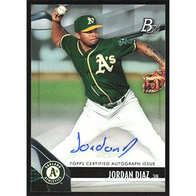 This is a 2021 Bowman Platinum Top Prospect Autographs Jordan Diaz autographed baseball card. This card has been signed, in blue, by Jordan Diaz, and is certified authentic by Topps. The card is #TOP-41 and pictures show condition.