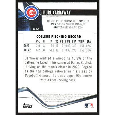 This is a 2021 Bowman Platinum Top Prospects Ice Burl Carraway baseball card. The card is #TOP-3 and pictures show condition.
