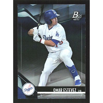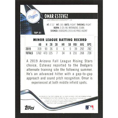 This is a 2021 Bowman Platinum Top Prospects Omar Estevez baseball card. The card is #TOP-51 and pictures show condition.