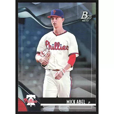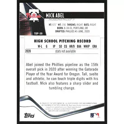 This is a 2021 Bowman Platinum Top Prospects Mick Abel baseball card. The card is #TOP-59 and pictures show condition.