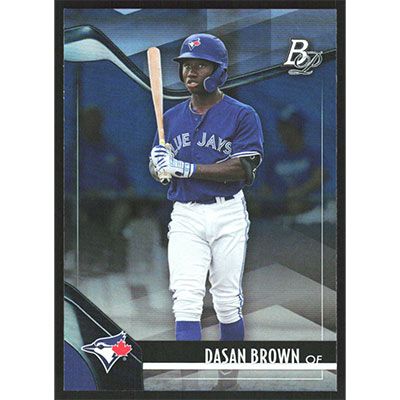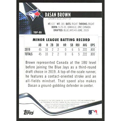 This is a 2021 Bowman Platinum Top Prospects Dasan Brown baseball card. The card is #TOP-99 and pictures show condition.
