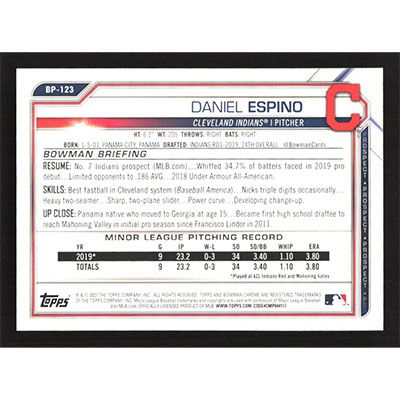 This is a 2021 Bowman Prospects Daniel Espino baseball card. The card is #BP-123 and pictures show condition.