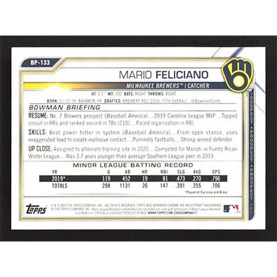 This is a 2021 Bowman Prospects Mario Feliciano baseball card. The card is #BP-133 and pictures show condition.
