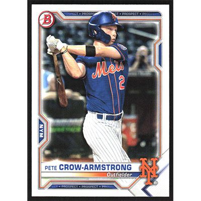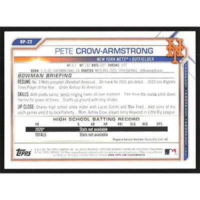 This is a 2021 Bowman Prospects Pete Crow-Armstrong baseball card. The card is #BP-22 and pictures show condition.