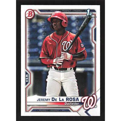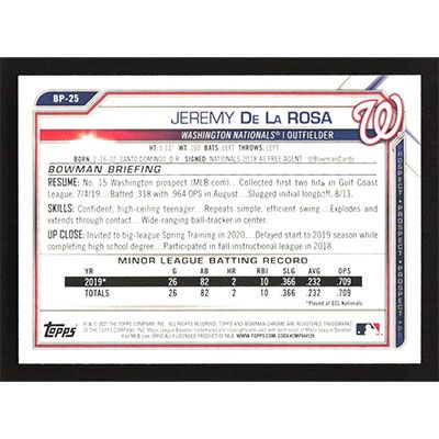 This is a 2021 Bowman Prospects Jeremy De La Rosa baseball card. The card is #BP-25 and pictures show condition.