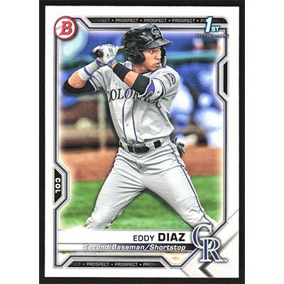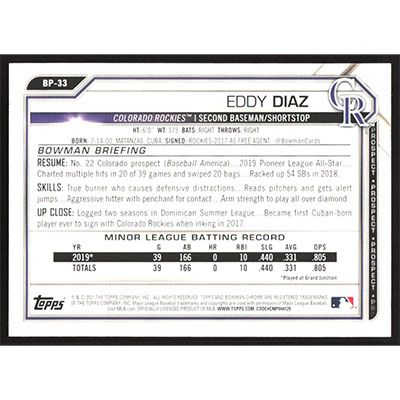 This is a 2021 Bowman Prospects Eddy Diaz baseball card. The card is #BP-33 and pictures show condition.