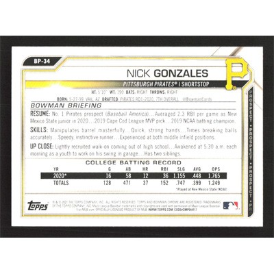 This is a 2021 Bowman Prospects Nick Gonzales baseball card. The card is #BP-34 and pictures show condition.