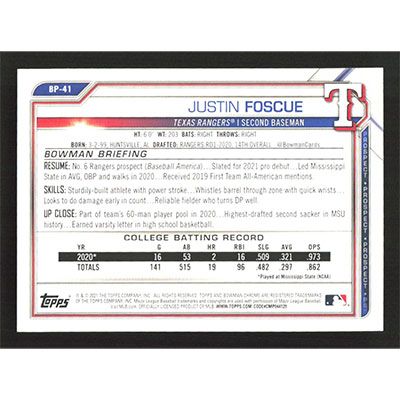 This is a 2021 Bowman Prospects Justin Foscue baseball card. The card is #BP-41 and pictures show condition.