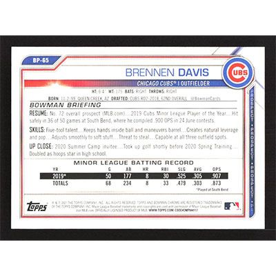 This is a 2021 Bowman Prospects Brennen Davis baseball card. The card is #BP-65 and pictures show condition.