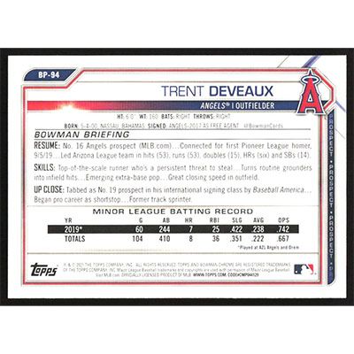 This is a 2021 Bowman Prospects Trent Deveaux baseball card. The card is #BP-94 and pictures show condition.