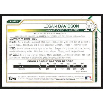 This is a 2021 Bowman Prospects Camo Logan Davidson baseball card. The card is #BP-115 and pictures show condition.