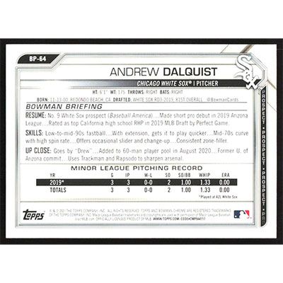 This is a 2021 Bowman Prospects Camo Andrew Dalquist baseball card. The card is #BP-64 and pictures show condition.