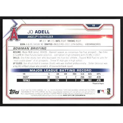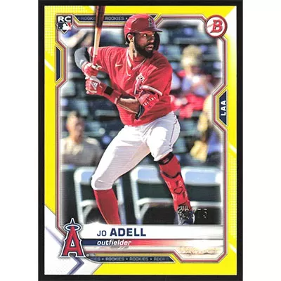 This is a 2021 Bowman Yellow Jo Adell baseball card. The card is #10 and pictures show condition. This card is limited; #'d 30/75. Team(s): Los Angeles Angels Rookie Card (RC)