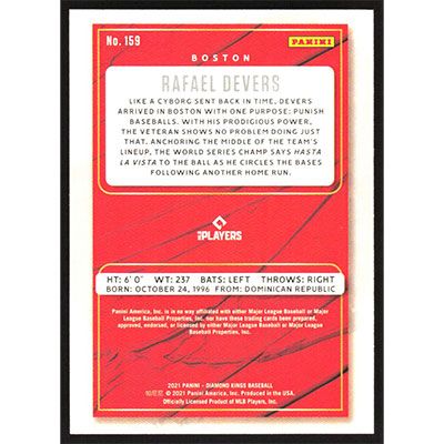 This is a 2021 Diamond Kings Rafael Devers short print baseball card. The card is #159 and pictures show condition.