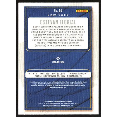 This is a 2021 Diamond Kings Estevan Florial baseball card. The card is #56 and pictures show condition.