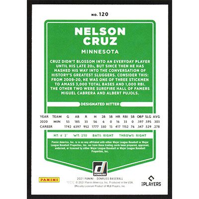 This is a 2021 Donruss Nelson Cruz baseball card. The card is #120 and pictures show condition.