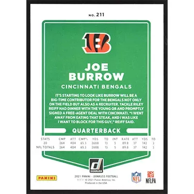 This is a 2021 Donruss Joe Burrow football card. The card is #211 and pictures show condition.