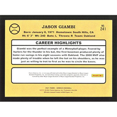 This is a 2021 Donruss Jason Giambi Retro baseball card. The card is #241 and pictures show condition.