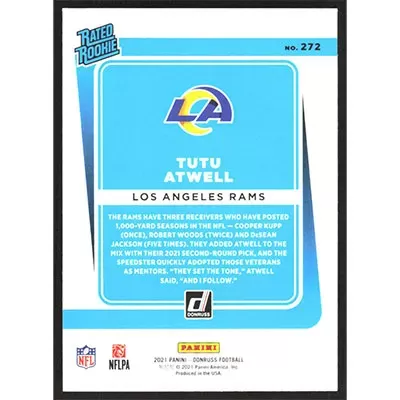 This is a 2021 Donruss Tutu Atwell Rated Rookie football card. The card is #272 and pictures show condition.