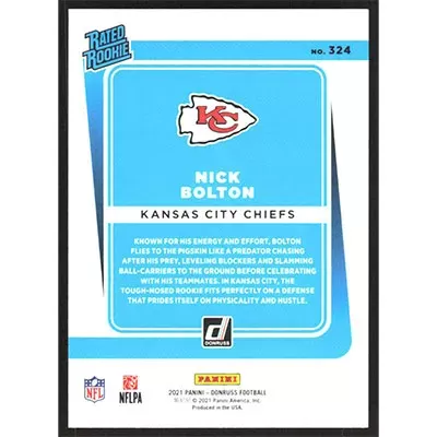 This is a 2021 Donruss Nick Bolton Rated Rookie football card. The card is #324 and pictures show condition.
