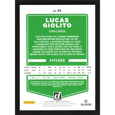This is a 2021 Donruss Lucas Giolito baseball card. The card is #90 and pictures show condition.