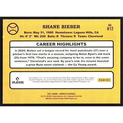 This is a 2021 Donruss Highlights Shane Bieber baseball card. The card is #H12 and pictures show condition. This card is limited; #'d 780/999. Team(s): Cleveland Indians