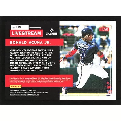 This is a 2021 Donruss Livestream Ronald Acuña Jr. baseball card. The card is #LS5 and pictures show condition. This card is limited; #'d 241/999. Team(s): Atlanta Braves