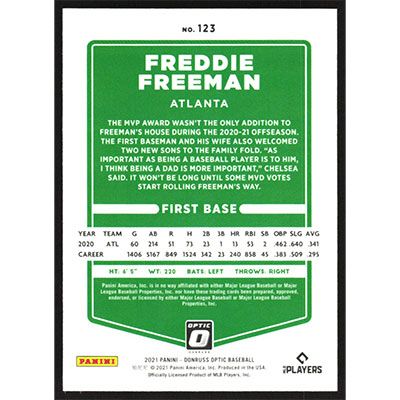 This is a 2021 Donruss Optic Freddie Freeman baseball card. The card is #123 and pictures show condition.