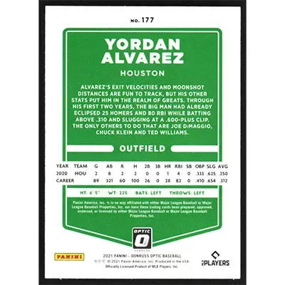 This is a 2021 Donruss Optic Yordan Alvarez baseball card. The card is #177 and pictures show condition.