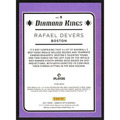 This is a 2021 Donruss Optic Pink Rafael Devers Diamond Kings baseball card. The card is #5 and pictures show condition.