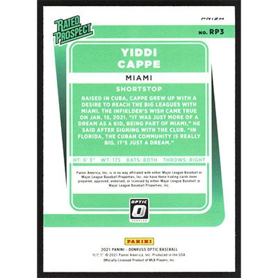 This is a 2021 Donruss Optic Rated Prospects Holo Yiddi Cappe baseball card. The card is #RP3 and pictures show condition.