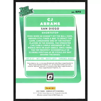 This is a 2021 Donruss Optic Rated Prospects CJ Abrams baseball card. The card is #RP9 and pictures show condition.