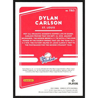 This is a 2021 Donruss Optic The Rookies Dylan Carlson baseball card. The card is #TR3 and pictures show condition. Team(s): St. Louis Cardinals Rookie Card (RC)