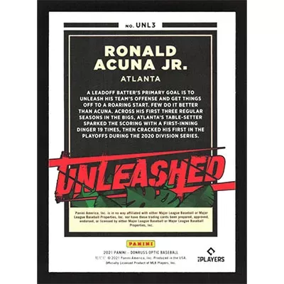 This is a 2021 Donruss Optic Unleashed Ronald Acuña Jr. baseball card. The card is #UNL3 and pictures show condition.