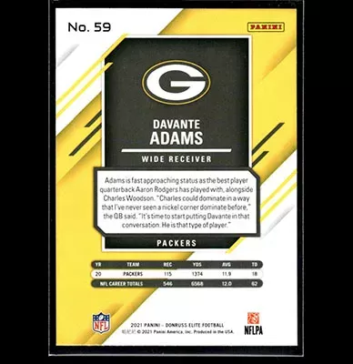 This is a 2021 Elite Davante Adams football card. The card is #59 and is in NM-MT condition.