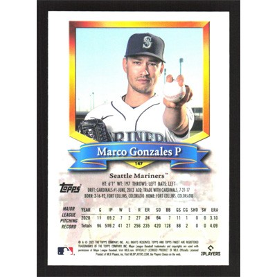 This is a 2021 Finest Flashbacks Marco Gonzales baseball card. The card is #147 and pictures show condition.