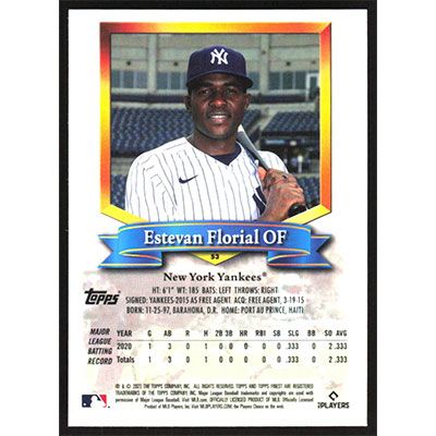 This is a 2021 Finest Flashbacks Estevan Florial baseball card. The card is #53 and pictures show condition. Team(s): New York Yankees Rookie Card (RC)