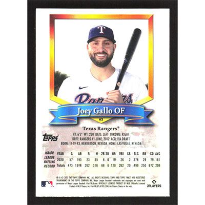 This is a 2021 Finest Flashbacks Joey Gallo baseball card. The card is #62 and pictures show condition.