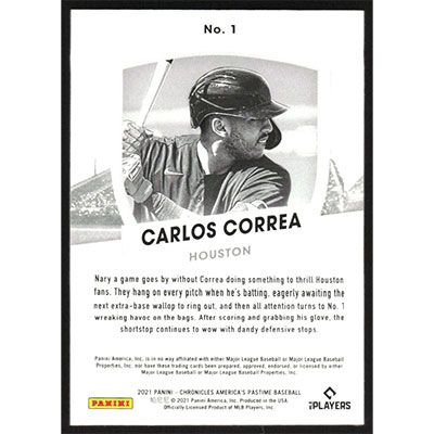This is a 2021 Panini Chronicles America's Pastime Carlos Correa baseball card. The card is #1 and pictures show condition.