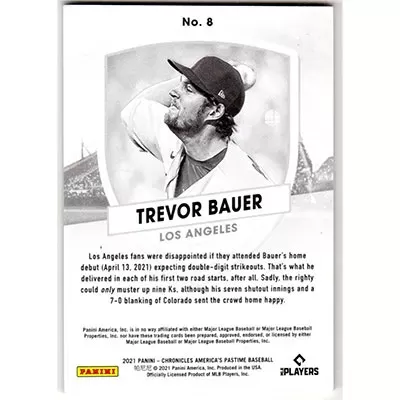 This is a 2021 Panini Chronicles America's Pastime Trevor Bauer baseball card. The card is #8 and pictures show condition. Team(s): Los Angeles Dodgers