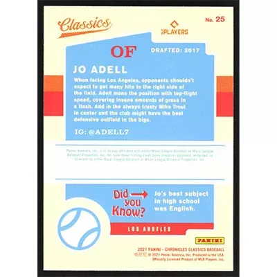 This is a 2021 Panini Chronicles Classics Jo Adell baseball card. The card is #25 and pictures show condition. Team(s): Los Angeles Angels Rookie Card (RC)
