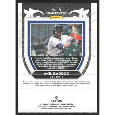 This is a 2021 Panini Chronicles Crusade Blue Velocity Akil Baddoo baseball card. The card is #14 and pictures show condition. Team(s): Detroit Tigers Rookie Card (RC)